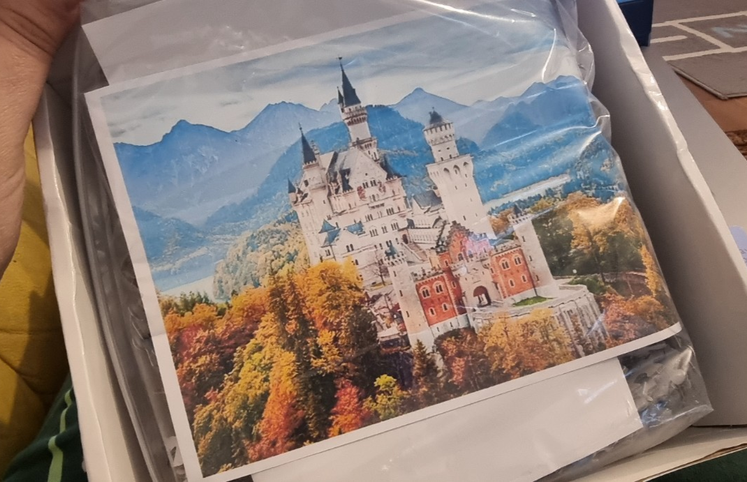 Όταν άνοιξα το κουτί και είδα τα εκατοντάδες μικρά κομμάτια, σκέφτηκα ότι στην αρχή όλα μοιάζουν λίγο χαοτικά. Χρώματα, γωνίες, ουρανός, δέντρα, βουνά. Και όμως, όπως ακριβώς συμβαίνει και στη ζωή, κομμάτι κομμάτι αρχίζει να σχηματίζεται μια εικόνα. Πρώτα εμφανίζεται ο ουρανός, μετά τα βουνά της Βαυαρίας, μετά τα χρυσαφένια φθινοπωρινά δάση. Και ξαφνικά, μέσα από όλα αυτά, εμφανίζεται το κάστρο. Ψηλό, λευκό, σαν να αιωρείται πάνω από τα δέντρα, σαν να βγήκε από κάποιο παιδικό παραμύθι.